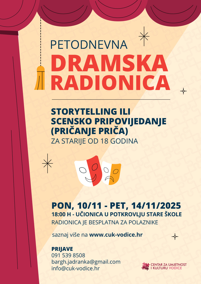 Centar za umjetnost i kulturu Vodice organizira dramsku radionicu STORYTELLING ili SCENSKO PRIPOVIJEDANJE (PRIČANJE PRIČA) za starije od 18 godina koju će voditi Jadranka Bargh, kazališna umjetnica, dramaturginja, umjetnička voditeljica, glumica i autorica Pripovjednoga kazališta.