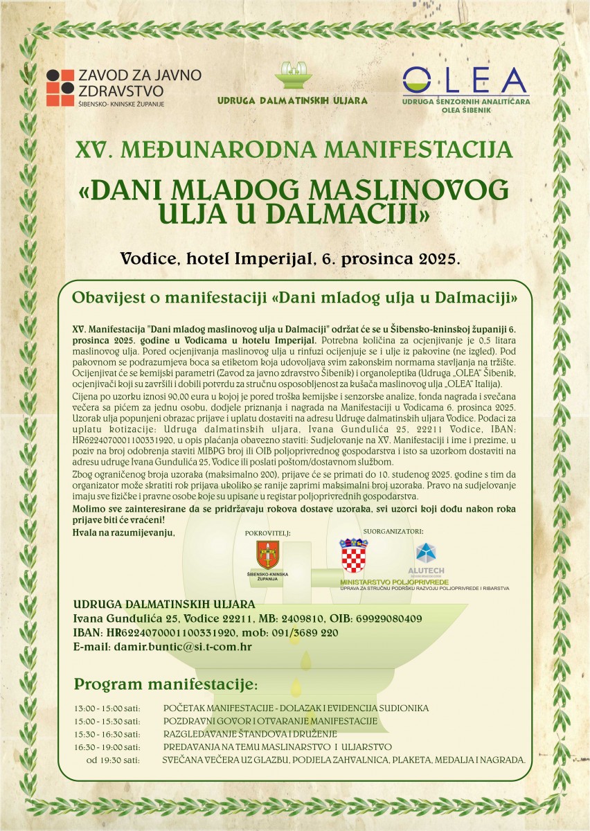 XV. Manifestacija "Dani mladog maslinovog ulja u Dalmaciji" održat će se 6. prosinca 2025. godine u Vodicama u Hotelu Imperial. Potrebna količina za ocjenjivanje je 0,5 litara maslinovog ulja. Pored ocjenjivanja maslinovog ulja u rinfuzi ocjenjuje se i ulje iz pakovine (ne izgled). Pod pakovinom se podrazumijeva boca sa etiketom koja udovoljava svim zakonskim normama stavljanja na tržište. Ocjenjivat će se kemijski parametri (Zavod za javno zdravstvo Šibenik) i organoleptika (Udruga „OLEA“ Šibenik, ocjenjivači koji su završili i dobili potvrdu za stručnu osposobljenost za kušača maslinovog ulja „OLEA“ Italija).
